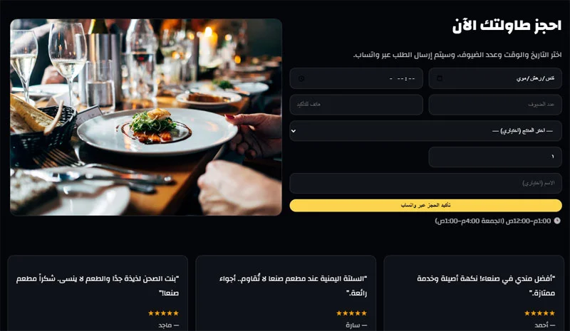 كما يوفّر السكربت واجهة أنيقة وسريعة تُظهر الأطباق بطريقة جذّابة تعكس هوية المطعم وجودة الطعام. وبفضل التصميم المتجاوب، يمكن للعميل تصفح المنيو، إرسال الطلبات، أو حجز طاولته بضغطة زر من أي جهاز. إضافة إلى ذلك، يدعم النظام ربط الطلبات عبر واتساب، مما يختصر الوقت ويجعل التواصل أكثر سلاسة.